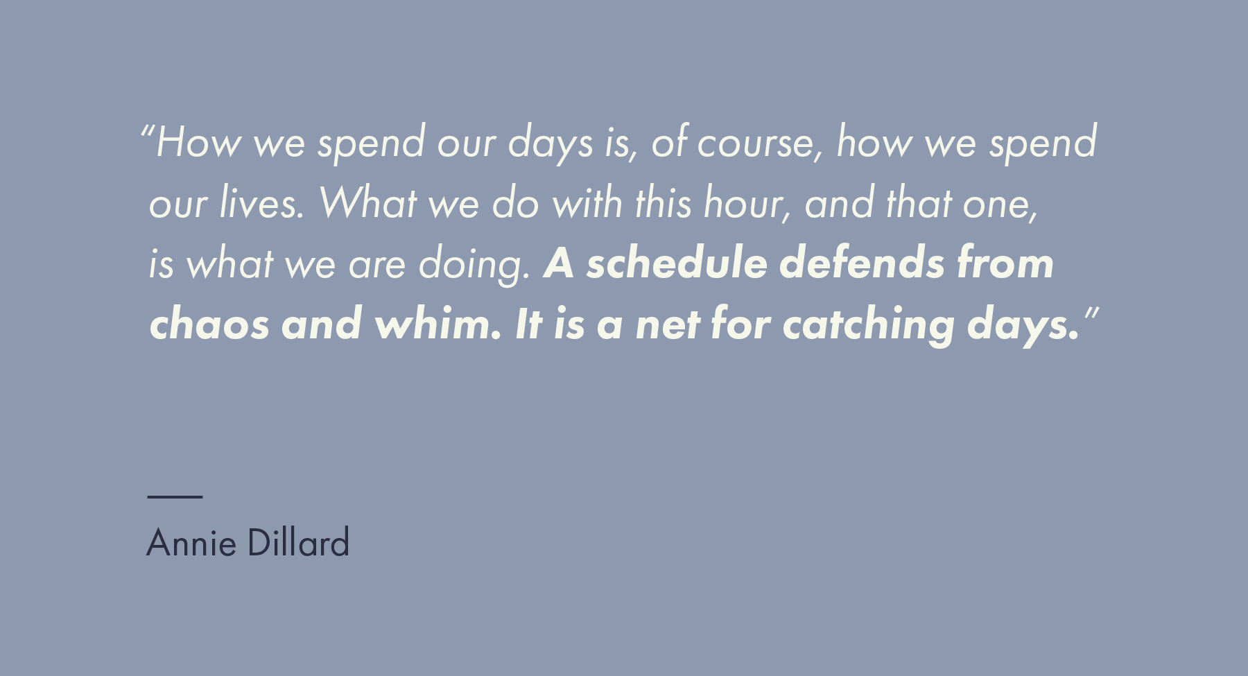 Her description of the value of a schedule is lovely and apt (as is the sentiment regarding how we spend our days), and I wholeheartedly agree on all points. A schedule is a beautiful thing, and I can’t imagine a working day without one.